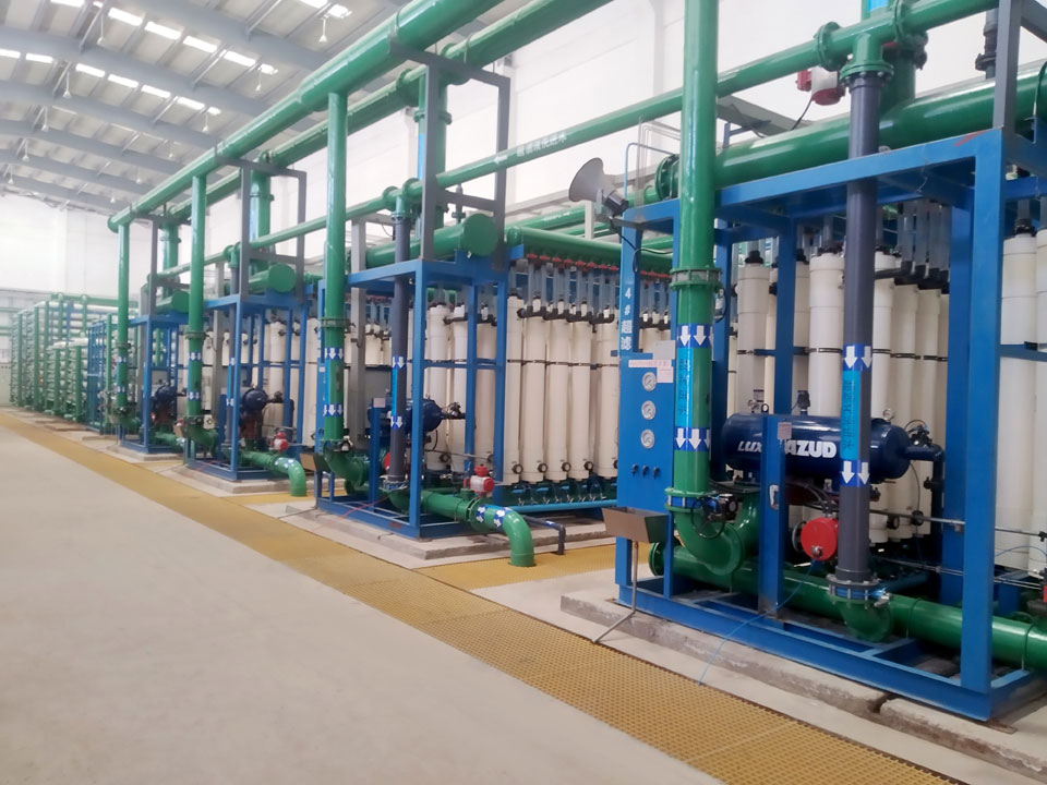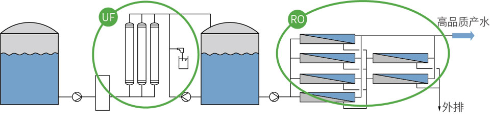 “超滤膜+反渗透膜”是目前以反渗透膜为核心工艺最常用的水处理工艺流程,超滤(UF)是以压力为驱动的膜分离过程,它能够将颗粒物质从流体及溶解组份中分离出来。超滤膜的典型孔径在0.01-0.1μm之间,对于细菌和大多数病菌、胶体、淤泥等具有极高的去除率,作为反渗透的预处理系统,处理效果稳定,对污染物去除率高,对反渗透系统起到很好的保护作用。反渗透系统则利用其良好的脱盐性能,去除水中的各种溶解性离子,产水达到回用标准。