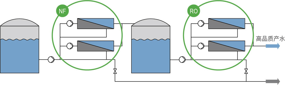 反渗透在脱盐浓缩方面效果很好,最适宜稀溶液的浓缩,对浓度高的溶液处理受渗透压和膜本身耐压的限制,水回收率低,而纳滤膜具有半脱盐性能,可以让单价离子部分通过而截流二价以上的离子,虽然纳滤去除离子的能力不及反渗透,但是与反渗透相比,纳滤具有操作压力低,出水效率高、浓缩水排放少等优点。如果把反渗透脱水和纳滤结合起来,各自发挥优势,既减少了工程造价,回收率也比反渗透高,又减少了浓水的排放总量。