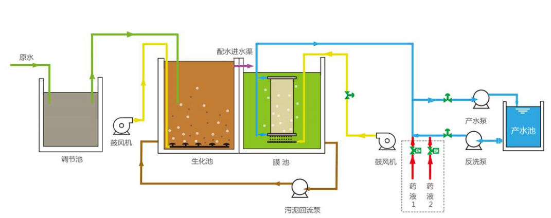 由于MBR膜大大提高了系统固液分离的能力,从而使系统出水水质和容积负荷都得到大幅度提高,经膜处理后的出水水质优于国家一级A标准,经消毒后可直接作为新生水源。